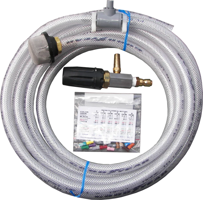 This easy to use item attaches to both your pressure washer wand and its own special X-Jet suction hose (included). As pressurized water exits your spray lance, through the X-Jet nozzle, the suction hose draws and proportions the appropriate amount of chemical from a separate tank. The mixing happens in the nozzle! Simply twist the X-Jet M5 to change spray patterns from 5° to 60°, without the need for multiple tips.